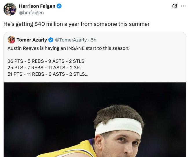 面对里夫斯这样的表现,尤其是詹姆斯、东契奇缺席时,以“180俱乐部效率”场均拿下40.4分6.2篮板10助攻2.8抢断,湖人队记Harrison Faigen坦言,明年夏天里夫斯将拿到4000万美元年薪合同。